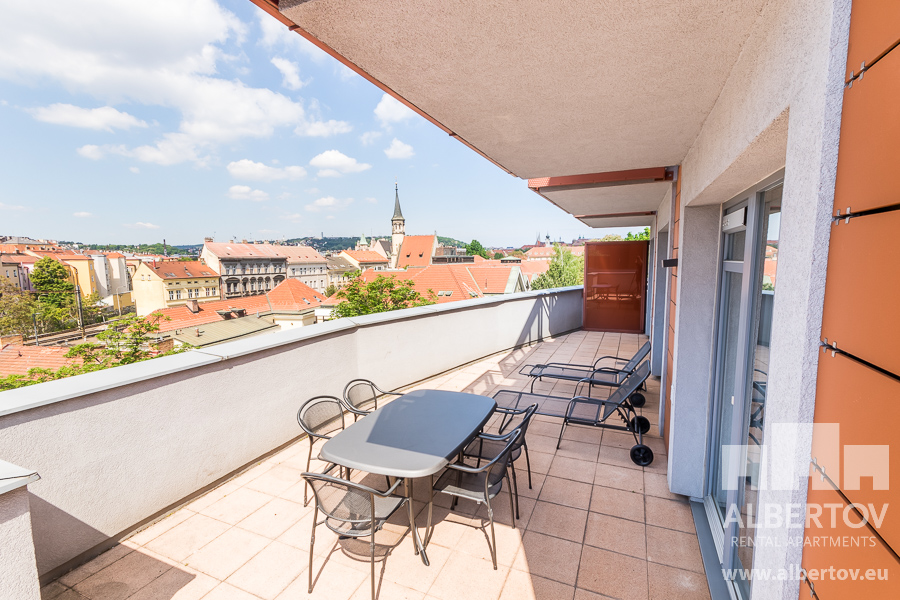Apartmán se nachází v 5. patře budovy uzavřeného rezidenčního komplexu Albertov Rental Apartments, v klidné části pod Vyšehradem, nedaleko centra.
